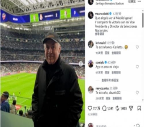安切洛蒂重返伯纳乌观看比赛,社媒晒照:看到皇马取胜太开心了