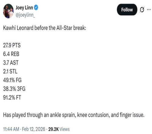 另外一名快船记者Joey Linn更是曝出,除了手指伤病之外,小卡实际上还带着脚踝扭伤和膝盖挫伤在坚持作战。