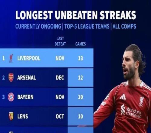 米兰圈德转盘点了目前五大联赛球队各项赛事现存最长不败场次榜,具体如下:1、利物浦 13场2、阿森纳 12场3、拜...